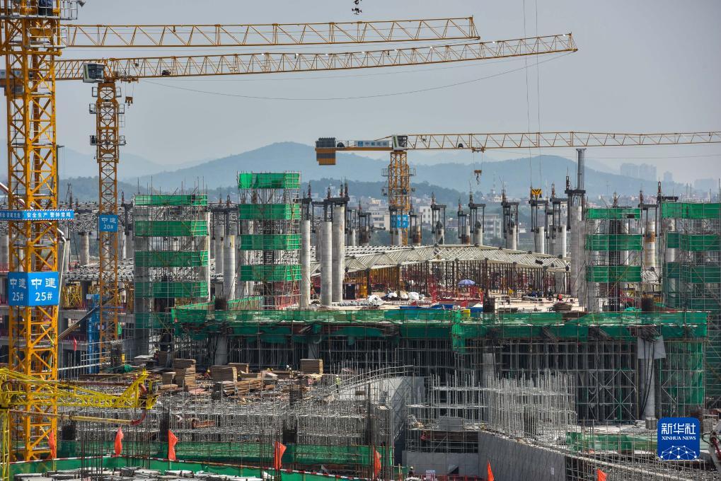 广州白云国际机场T3航站楼施工现场(9月27日摄)。 目前,中建三局承建的广州白云国际机场三期扩建工程T3航站楼主体结构施工进入冲刺阶段,项目钢结构工程全面铺开,幕墙、屋面和机电安装准备工作已展开。建成投产后,白云机场年旅客吞吐能力、货邮吞吐能力将分别达到1.2亿人次、380万吨。 新华社记者 刘大伟 摄