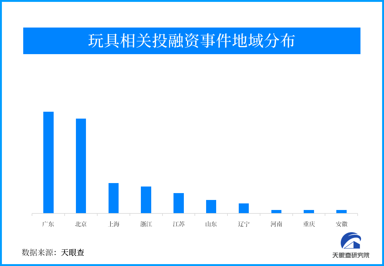 从融资企业的地域分布来看,广东、北京以及上海,融资企业数量位居前列,分别拥有30家、28家以及9家。具体来看,广东是我国最大的玩具生产地,拥有完整的产业链路,想做玩具相关企业的创业者第一选择必然是去广东寻找机会;北京、上海其优势在于强大的文化资源,IP资源以及相当数量的文化创意企业以及从业者,带IP属性的玩具越来越受到玩家的喜爱,自然创业者会来北京,上海“淘金”。