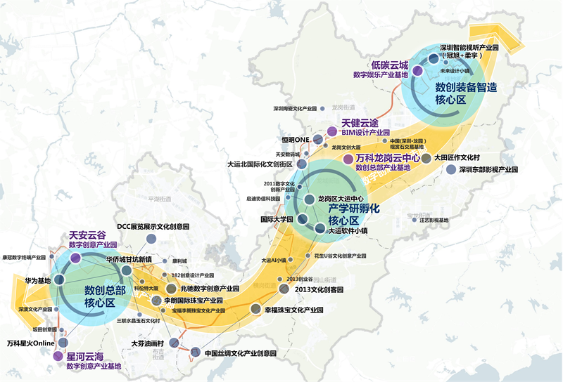 龙岗数字创意产业走廊 “五朵云”的家安在这条“走廊”上 绵延46公里贯穿整个龙岗、总面积32平方公里、文化企业营业收入占全区总数的80%以上(2021年数据)……在深圳、广东省乃至全国都鲜有一条如此规模和独具特色的数字创意走廊。它已经创下多个“首个”! 数字创意产业已被列入市委、市政府的“20+8”产业集群和未来产业的战略规划之中,而数字创意产业集群在全市规划为“一核一廊多区”,其中的“一廊”即龙岗数字创意产业走廊(后简称“数创走廊”)。 数创走廊是深圳首个国家级文化产业示范园区创建单位。2020年12月,走廊获得第二批国家级文化产业示范园区创建资格,是深圳市首个、也是广东省第二个此类项目。作为全国首个数字创意产业集聚区,龙头企业、文创产业园、重大项目等鳞次栉比分布在这条走廊上。 特别值得关注的是,这条“超级走廊”上有“5朵祥云”盘踞!从西往东这条走廊盘踞着5朵色彩异呈的祥云,分别是星河云海、天安云谷、龙岗云中心、天健云途和低碳云城。 一起步入“云层”,探一探这“5朵祥云”将为走廊如何绘就一幅云锦画卷吧!