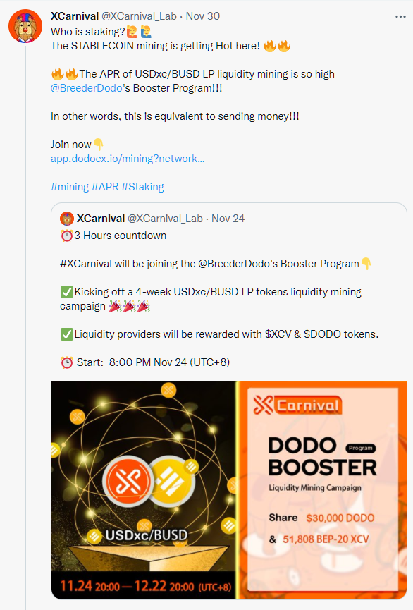 其实这都不是今天我要说的重点,今天我要说的重点是,Carnival和DODO目前在DODO上联合搞的USDxc/BUSD矿池,可以用稳定币白漂,而且年化高达上百!这是目前我了解的年化 的稳定币白漂的地方了!