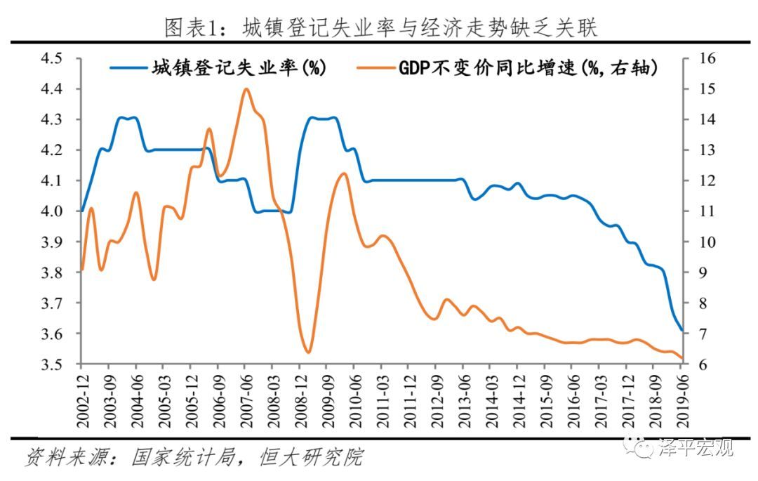 什么是就业?根据国际劳工组织的定义,在调查参考周内为了取得劳动报酬或经营收入而工作了至少1小时的人口,以及休假、临时停工等在职但未工作的人口,均被视为就业人员。因此,就业形势的判断不仅需要观察总体失业率、分年龄失业率等,还需要观察岗位空缺和求职人数比例、就业人员平均劳动时间、薪资增速、兼业比例等指标,中国在就业统计上虽有改进,但仍存在明显问题,对真实就业形势难以充分反映。 1)城镇登记失业率依赖失业者主动前往人社部门登记,且只针对非农人口,数据波动小,2019年二季度降至3.61%,与经济走势缺乏关联。1980年代初,中国开始建立登记失业制度,当时称“待业统计”,1994年才改为“登记失业”。城镇登记失业率=城镇登记失业人员/(城镇从业人员+城镇登记失业人员)。城镇登记失业人员是有非农业户口、16周岁以上至退休年龄内、有劳动能力、无业而要求就业,且自愿主动前往公共就业服务机构进行登记的失业者。显然,登记失业人员不包括农民工等外来常住人口,难以反映真实失业情况。从数据看,2002-2016年城镇登记失业率长期稳定在4.0%-4.3%之间,2017年开始持续下降至2019年6月的3.61%,这与经济增长趋势明显不符。