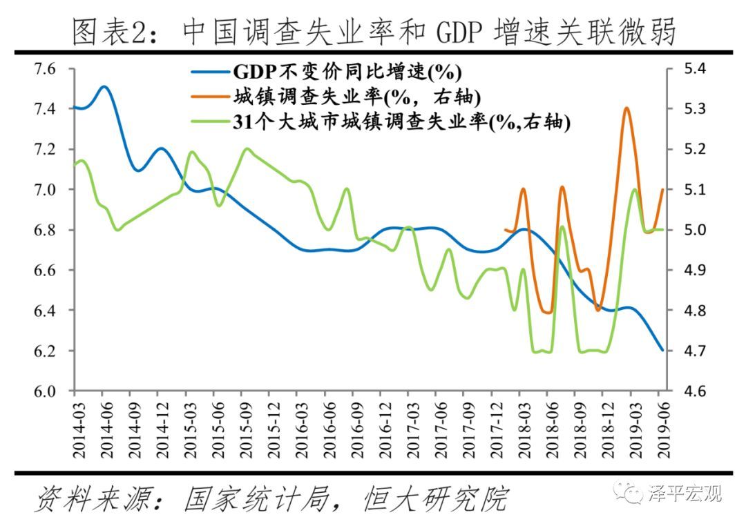2)调查失业率从2018年初开始正式公布,但调查样本8.5万户城镇家庭仅占中国城镇就业人数的约0.03%,抽样率仅为美国0.07%的一半,且样本轮换问题导致对农民工群体的代表性不足。鉴于城镇登记失业率的上述问题,国家统计局从2005年开始正式实施每年两次的全国劳动力抽样调查,2009年开始建立31个大城市月度劳动力抽样调查制度,2013年扩大到65个城市,2016年月度劳动力调查范围覆盖全国所有地级市(州、盟)、样本12万户家庭,2018年初开始持续公布城镇调查失业率数据。与城镇登记失业率明显不同,中国城镇调查失业率按照常住人口统计,并采用国际劳工组织的失业标准,即16周岁及以上、没有工作但近3个月在积极寻找工作的人员。 从趋势上看,中国城镇调查失业率和31个大城市城镇调查失业率均与GDP走势关联微弱,数据时期相对较长的31个大城市失业率与GDP增速基本保持同向变动。从城镇调查失业率看,2018年1月至今始终在4.8%-5.3%区间波动,2019年1月开始持续高于5%,2019年6月为5.1%。由于城镇调查失业率与5%左右的自然失业率接近,官方认为没有周期性失业。从同比看,城镇调查失业率从2018年1月的-0.2个百分点基本持续上升到2019年6月的0.3个百分点。 我国城镇调查失业率统计依然存在三方面问题:一是样本不足。月度劳动力调查的12万户样本中城镇约有8.5万户(住户单元),仅占中国城镇就业人数的0.03%;而美国在失业率统计中调查样本为6万家庭,约占美国非农就业人数的0.07%。二是对外来常住人口的代表性可能不足。在调查中,为避免样本老化,国家统计局采用样本轮换,即两年内完成4次调查后退出调查,这意味着调查人员必须找到比较稳定居住的家庭,流动性较强的常住外来人口可能会被排除在外。并且,当就业形势不好时,部分农民工返回农村,使得城镇失业率在数据体现上较低。三是抽样框老化。据地方统计部门反映,目前以2010年第六次人口普查资料为初级抽样框,每年虽然进行更新,但在实践中仅是简单扩充,新建小区依然无法进入抽样框,导致现有调查样本老化严重,样本代表性差。