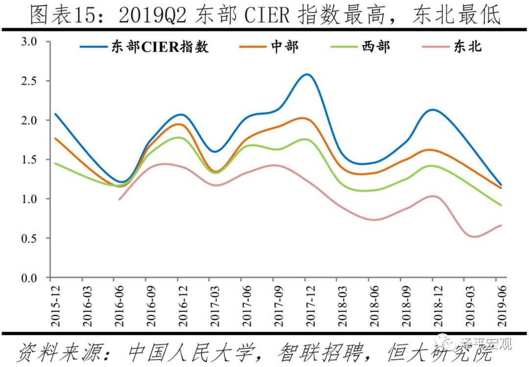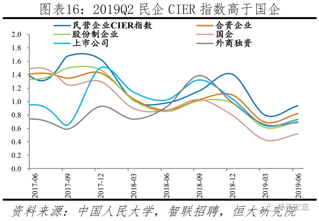 2.3 人民大学和智联招聘CIER指数二季度仍处低位 CIER指数为智联招聘网站上招聘需求和申请人数的比值,2019年二季度为1.89,虽同比微升但仍处低位。CIER指数是中国人民大学就业研究所和智联招聘联合推出的中国就业市场景气指数,采用智联招聘全站数据分析而得,是目前非官方就业统计中质量较好、且时间较长的数据。CIER指数=全部招聘需求/全部申请人数,以1为分水岭,大于1时表明就业市场中劳动力需求多于市场劳动力供给,就业市场竞争趋于缓和,就业市场景气程度高。2019年二季度CIER指数为1.89,环比、同比分别上升0.21、0.01。从环比看,上升幅度较大主要是因为季节性因素,进入二季度后用工需求明显增长,需求人数环比增加15.7%,而春节返工跳槽高峰过后求职供给增长放缓,求职申请人数环比增加2.7%。从同比看,2019年二季度CIER指数仍维持在2015年二季度以来的低位。 分区域看,2019年二季度东部、中部、西部和东北的CIER指数分别为1.18、1.14、0.92、0.66,同比均有所下滑,且东部地区下滑最大;分线城市看,一线、新一线、二线、三线城市CIER指数分别为0.60、0.94、1.18、1.25,二线和三线城市下滑最大;分企业性质看,2019年二季度民企、国企CIER指数分别为0.94、0.52,同比也呈下滑趋势。根据中国人民大学就业研究所解释,分项CIER指数平均值不等于整体CIER指数,主要是因为可能存在求职者多次投递的情况,分项求职投递人数之和要大于整体求职人数。2019年二季度东部、中部、西部和东北的CIER指数分别为1.18、1.14、0.92、0.66,东部就业景气度最高,东北就业景气度最低;同比分别减少了0.28、0.19、0.19、0.07,东部的就业形势恶化最快。2019年二季度一线、新一线、二线、三线城市CIER指数分别为0.60、0.94、1.18、1.25,同比分别下降0.11、0.03、0.34、0.31个百分点,二线和三线城市下降幅度最大。2019年二季度民营企业、合资企业、股份制企业、国企、上市公司、外商独资企业CIER指数分别为0.94、0.82、0.70、0.52、0.73、0.69,同比分别下降0.04、0.05、0.15、0.35、0.29、0.23,国企下降幅度最大。