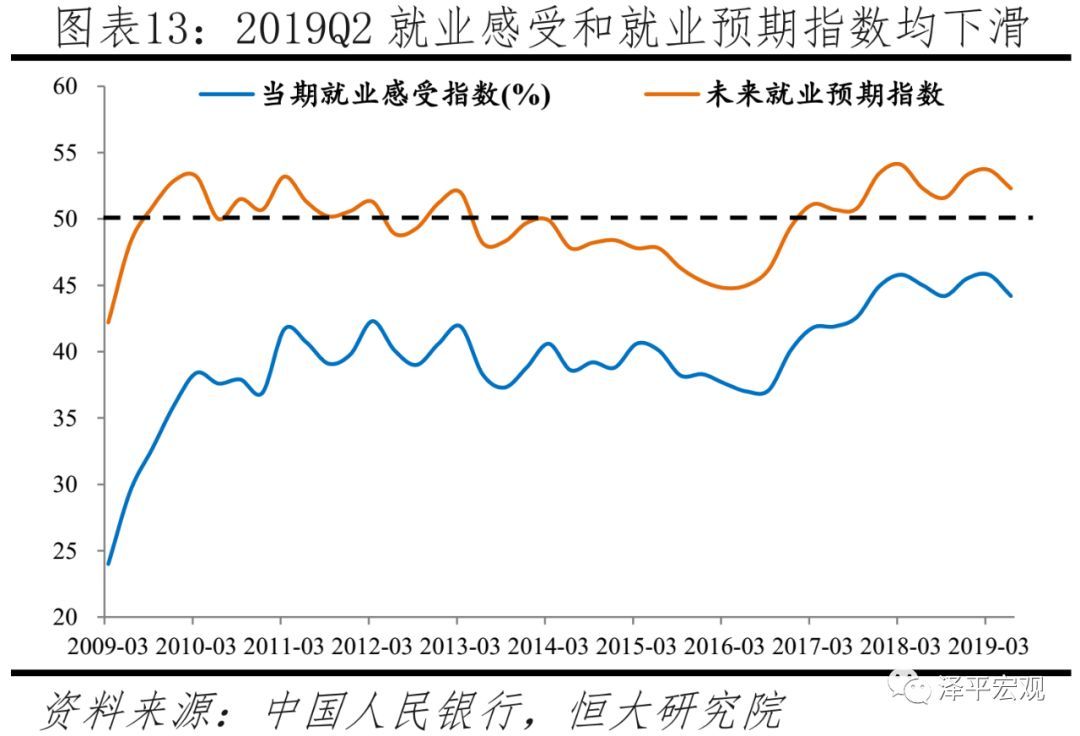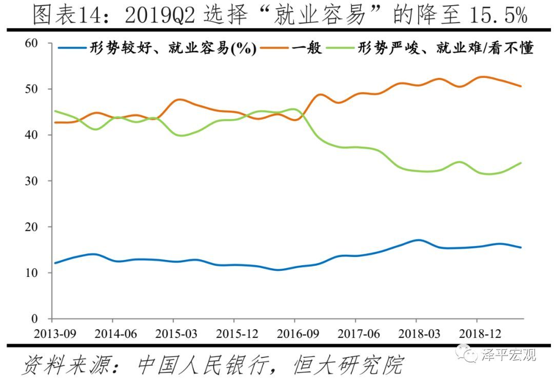 与此类似,在央行城镇储户问卷调查中,2019年二季度就业感受指数、就业预期指数分别为44.2%、52.3%,环比分别下降1.6、1.5个百分点。城镇储户问卷调查是中国人民银行1999年起建立的一项季度调查制度,每季在全国50个(大、中、小)调查城市选取20000名储户作为调查对象,就业感受指数和就业预期指数反映储户对就业的看法。2018年一季度至二季度,就业感受指数和就业预期指数均停止上升势头,并在波动中下降。2019年二季度就业感受指数为44.2%,环比、同比分别下降1.6、0.8个百分点;就业预期指数为52.3%,环比下降1.5个百分点,同比持平。2019年二季度在就业感受指数中选择“形势较好、就业容易”的人数占比为15.5%,环比下降0.8个百分点,同比持平。