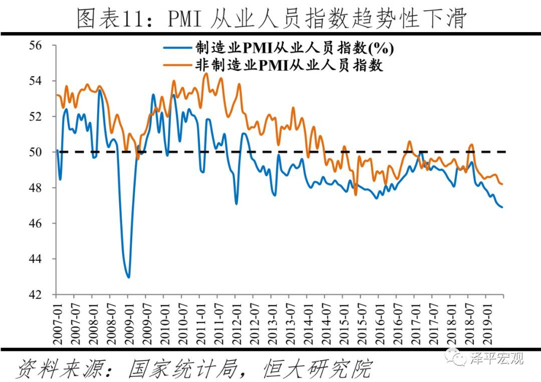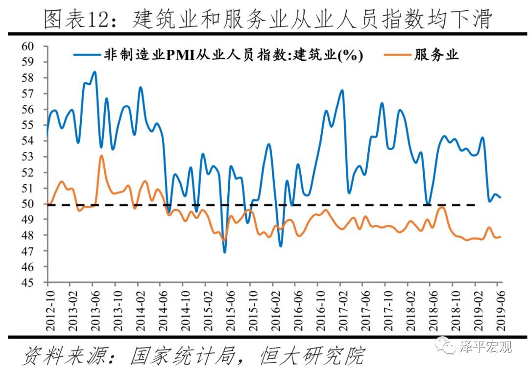从制造业PMI从业人员指数来看,2017年3月以后制造业PMI从业人员指数连续27个月低于50%;2019年6月降至46.9%,连续3个月下滑,环比、同比分别下滑0.1、2.1个百分点。其中,大型、中型、小型企业制造业PMI从业人员指数均从2018年下半年开始下滑,2019年6月分别为47.0%、45.9%、48.3%,同比分别下滑2.0、2.4、1.9个百分点,中型企业不仅绝对水平更低并且下滑幅度更大。 从非制造业PMI从业人员指数来看,2018年9月非制造业PMI从业人员指数开始持续低于50%,2019年6月降至48.2%,连续2个月下滑,环比、同比分别下滑0.1、0.7个百分点。其中,建筑业PMI从业人员指数从2019年3月的54.1%开始迅速下滑,2019年6月降至50.4%。服务业PMI从业人员指数2014年7月后持续低于50%,2018年8月从49.7%开始迅速下滑,2019年6月降至47.9%。