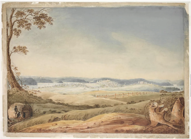 正是在上尉资助下,Lycett开始了作为一名合法艺术家的工作,创作 风景、自然历史绘画 ,还给这块土地的传统统治者 画像 。 2011年,新南威尔士州图书馆获得了James Wallis于1821年出版的 《新南威尔士殖民地历史记述》 的一本用插入材料装饰的特版书,里面包括原画、水彩画,以及由Wallis和Lycett创作的拼贴画,包括风景、土著人民的肖像、植物和自然历史插图。 其中五幅图上刻有“ 由一名罪犯绘制 ”的铭文,清楚地表明画家是Lycett。作为一名罪犯,他好像没法在自己的作品上署名,尽管如此,至少在其中一张 《从苏瑞山看悉尼》(Sydney from Surry Hills) 中,他成功地用几乎看不清的小楷印上了自己的姓氏Lycett,就在树根里。 从苏瑞山看悉尼,1819, by Joseph Lycett,来自新南威尔士州州立图书馆 (责任编辑:admin) |