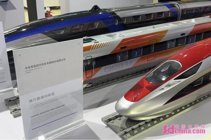 中国山东网-感知山东10月11日讯 作为第四届跨国公司领导人青岛峰会的配套展览,2023跨国公司与中国主题展在青岛拉开序幕,青岛城市展区吸引了大量嘉宾驻足,充分展现了“青岛制造”实力和青岛与跨国公司合作的丰硕成果。 助力合作发展 “青岛制造”成功走出国门 进入青岛展区,首先映入眼帘的就是由中车四方在青岛制造,出口印尼的雅万高铁列车。雅万高铁是中印尼共建“一带一路”合作旗舰项目,作为东南亚首条高速铁路,雅万高铁是中国高铁首次全系统、全要素、全产业链在海外落地,也是中国同地区国家坚持共商共建共享、携手迈向现代化的成功范例。