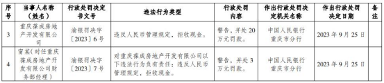 中国经济网北京10月1日讯 中国人民银行重庆市分行网站近日披露的行政处罚信息公示表(渝银罚决字〔2023〕6号、7号)显示,重庆葆成房地产开发有限公司违反人民币管理规定,拒收现金。甯某(时任重庆葆成房地产开发有限公司财务部经理)对前述违法行为负有责任。 中国人民银行重庆市分行对重庆葆成房地产开发有限公司警告,并处20万元罚款;对甯某警告,并处3万元罚款。 相关资料显示,重庆葆成房地产开发有限公司由保利(重庆)投资实业有限公司100%持股。 保利发展(600048.SH)2022年年报显示,保利(重庆)投资实业有限公司系保利发展100%持股子公司。 以下为处罚原文: