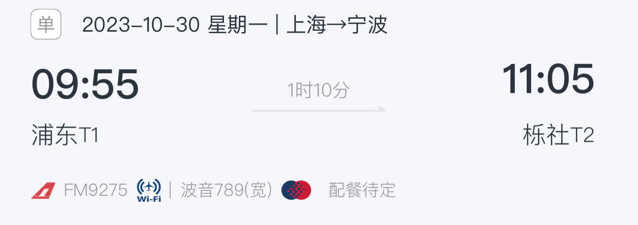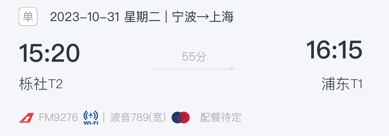宁波飞上海FM9276航班,由目前每周二、五的22:00从宁波起飞、23:05到达上海浦东T1,调整为每周二、五的15:20从宁波起飞、16:15到达上海浦东T1。