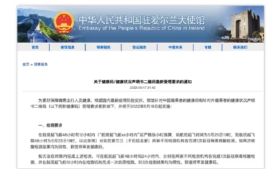 5。爱尔兰 为更好保障确需出行人员健康,根据国内最新疫情防控安排,我馆针对中国籍乘客的健康码和针对外籍乘客的健康状况声明书二维码(以下统称健康码)受理要求更新如下,并将于2022年5月18日起实施: 一、检测要求 在航班起飞前48小时和12小时内(“航班起飞前xx小时内”应严格按小时推算,如航班起飞时间为5月25日19时,则航班起飞前48小时为5月23日19时,以此类推)分别在爱尔兰(不包括北爱)两家不同检测机构各完成1次新冠病毒核酸检测。如两次核酸检测结果均为阴性,我馆将审发健康码。 如无法在时限内完成上述检测,可在航班起飞前48小时和24小时内,分别在两家不同检测机构各完成1次新冠病毒核酸检测,并在航班起飞前12小时内在检测机构完成一次抗原检测。如3次检测结果均为阴性,我馆将审发健康码。 二、检测机构 我馆接受爱尔兰境内符合资质的医院及检测机构出具的核酸、抗原检测报告。都柏林机场有可做加急核酸和抗原检测的机构(需预约,1-3小时内出结果)。