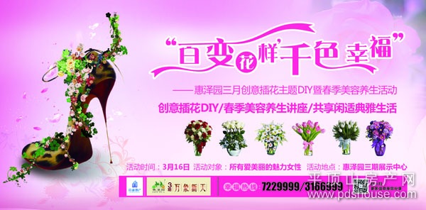 生活是你的主场,魅力是你的天性,春暖花开,优雅女性怎能不嗅闻馨香,聆听花语,共赴一场人与花的特殊约会。 3月16日,发挥您的绝妙创意,让一支支芳香四溢的鲜花,在您的纤纤巧手下,蝶变为一束束色彩斑斓、构思巧妙的花艺作品;还有春季美容养生讲座,由资深美容养生专家教您美丽升级、健康养生,悦有心,享有道,共享闲适典雅生活! 卸掉职场、生意的烦恼,让身心在欣悦花语的那一刻完全释放;更可为小公主、小宝贝们上一场美丽课和亲子课,3月16日,惠泽园三期万象新天三月创意插花主题DIY暨春季美容养生活动幸福启幕! 我们从来,只为您的魅力生活而努力! 有你才是魅力场!3月16日,惠泽园三期万象新天(光明路与南环路交叉口西500米路南)与您不见不散!伴您美丽演绎,指尖奇迹!