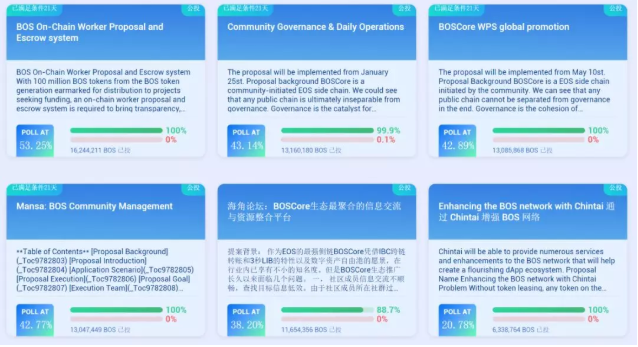 BOS推出了生态基金(含公投&WPS)计划,邀请更多的有识之士一起来建设BOS生态,通过全民公投的方式来立项并支付给为社区或生态做出重大的贡献的团队或个人,这是社区驱动最重要的体现之一。 自5月23日公投系统正式上线以来,短短三周时间,社区内已经有三十余项提案发布,涵盖生态运营推广、开发者工具、应用程序、技术组件等方方面面。 根据提案通过的条件:参与投票数量不少于提案发起时参与BP投票数量的40%;支持票/反对票的比率大于1.5;以上条件持续20天成立。目前,公投系统中已经有四项提案达成了通过的初始条件,成为第一批正式通过的提案。