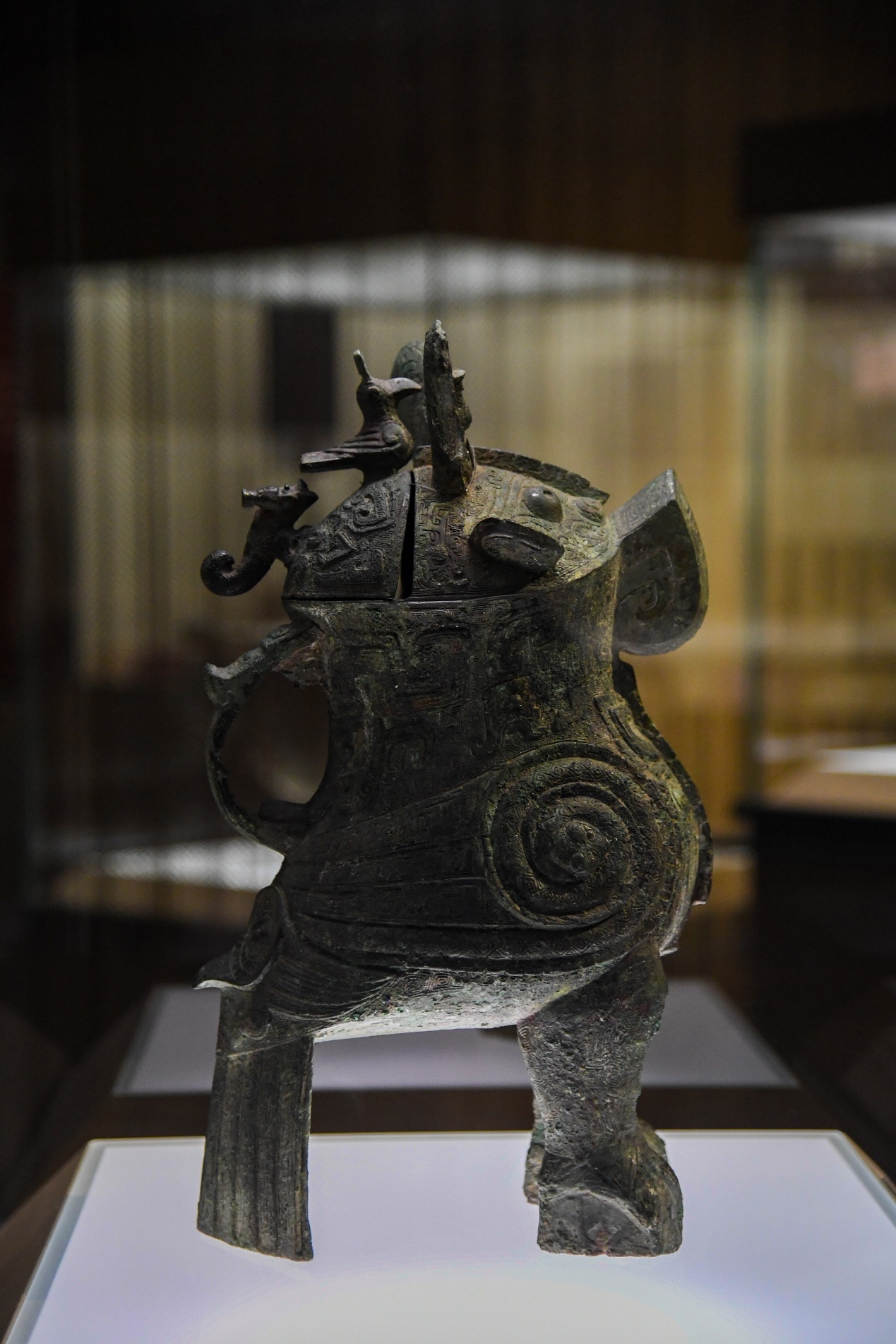 妇好青铜鸮尊,细节有趣 来自妇好墓的文物颇多,件件精美别致:5.6厘米高的跽坐人形玉佩,青玉小人上身挺直,双手扶膝,臀部坐在脚跟上,庄重有趣;青铜鸮尊,纹饰纷繁,正看是披着大氅、威严雄壮的“将军鸟”,背看却是小龙小鸟小鸮趴一身,有点“反差萌”;司母辛觥,前兽后鸟,造型雄奇,纹饰精致,展期也只有一个月,从殷墟博物馆展线搬来的代表器,那边还虚位以待呢…… 90后讲解员小刘说,中学历史课本上的司母戊大方鼎,是祭祀武丁另一位配偶的。武丁爱重妇好,但下一代商王非她所生。后代商王的祭祀,为妇好铸了80厘米高的司母辛大方鼎,但献给生母的司母戊鼎则高达133厘米。