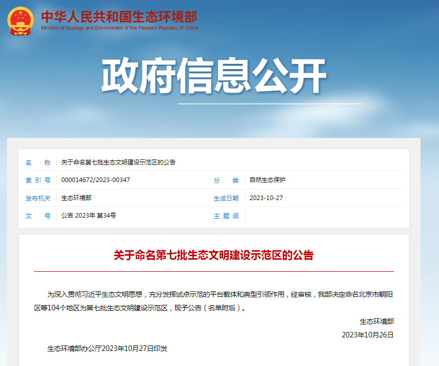 生态环境部在10月28日召开的中国生态文明论坛上,公布了第七批生态文明建设示范区和“绿水青山就是金山银山”实践创新基地名单。其中,贵州省贵阳市、贵阳市清镇市、黔南布依族苗族自治州荔波县入选。 北京市朝阳区、湖北省宜都市等104地,被命名为第七批生态文明建设示范区称号;河北省唐山市迁西县、山东省济南市历下区等53地,获得“绿水青山就是金山银山”实践创新基地称号。 从2017年以来,生态环境部一共命名了572个生态文明建设示范区和240个“绿水青山就是金山银山”实践创新基地。这些命名地区在提升绿色发展水平、创新生态文明制度、繁荣生态文化等方面,走在了前面,做出了表率,为提高区域生态环境质量、提升生态文明建设水平发挥了重要作用。