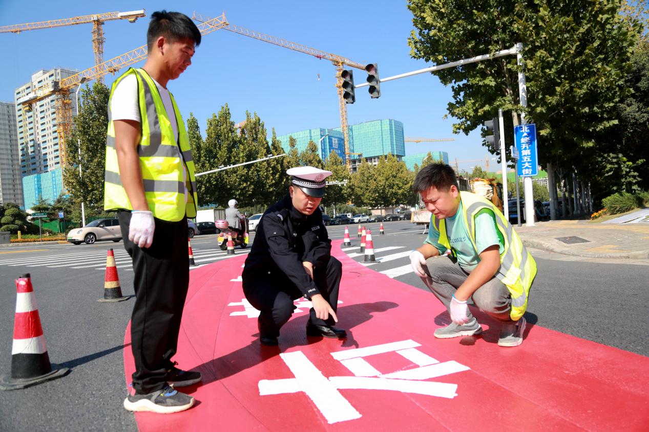 10月31日上午,在南三环与第五大街交叉口东北角,郑州市公安局公安交通管理局科研所和八支队的工作人员一起,对新施划的地面交通警示标志现场验收检查。