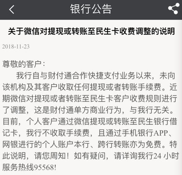 继小鸣单车用户押金申报初审完成之后,近日管理人又公布了“关于小鸣单车非用户普通债权人申报债权审核结果的公告”,三十名非用户普通债权人的确认债权共计1920余万元,其中梅州市凯达共享单车有限公司确认的债券就近1400万元,它是小鸣单车的供应商之一,如今是小鸣单车最大的债权人。小鸣散落各地的单车,中国再生资源开发有限公司也同意进行回收,每辆车12元。 6.民生银行:微信上调民生卡提现手续费系单方商业行为
