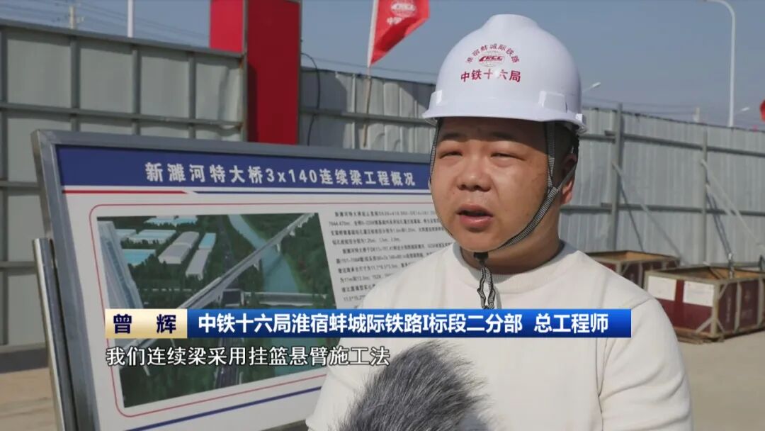 中铁十六局淮宿蚌城际铁路I标段二分部 总工程师 曾辉 我们连续梁采用挂篮悬臂施工法,由原来的3米一个节段,改为6米一个节段,大大地节省了我们施工的周期,预计在明年5月份实现全桥的合龙。
