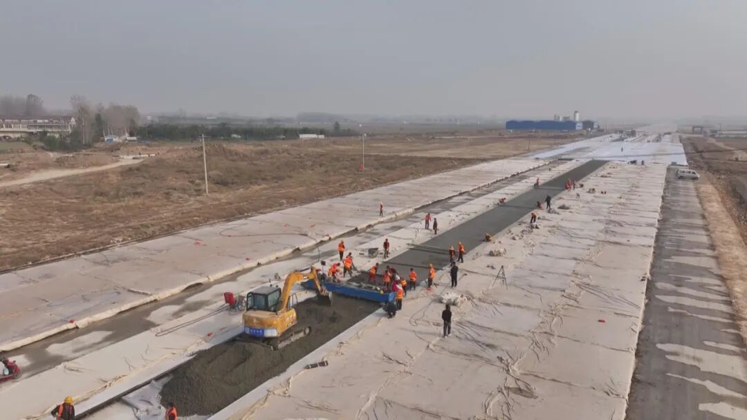 在蚌埠民用机场飞行区跑道工程施工现场,工人们正忙着进行道面混凝土施工作业,机场跑道建设已初具雏形。