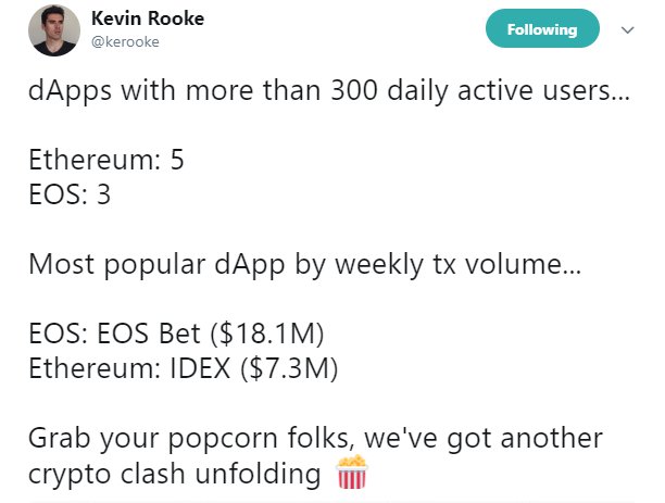据密码货币研究员 Kevin Rooke 的说法,当前,以太坊和 EOS 这两大公链平台上日活用户数超过 300 人的去中心化应用(dApp),一共只有 8 个。