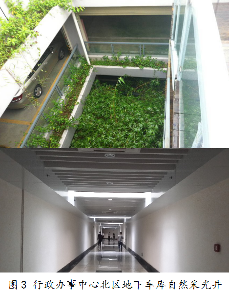 图2行政办事中心遮阳窗帘 经测算,每年可节省电量约62.55万度,折合标准煤76.87吨,节省电费56.30万元。 2.应用自然采光通风井,降低地下停车场能耗。 原理:地下停车库主要耗能来自新风和照明系统,通过合理设置自然采光通风井,大幅降低耗能系统的使用时间,降低能耗。 应用和效果:市行政办事中心北楼地下车库建筑面积为4.24万平方米,设车位1625个。通过设置32个采光通风井,实现自然采光与通风,在自然光线充足情况下,可关闭绝大部分地下停车库的照明灯具,并大幅减少新风系统使用时间。同时,井内种植了绿化植物,可吸收汽车排放的废气,提高环境舒适性。 据测算,该项设计年节电43.80万度,折合标准煤53.83吨,年节约费用39.42万元。