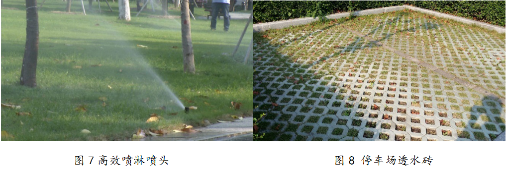 7.应用高效喷淋灌溉等节水技术。 市行政办事中心采用了绿化高效喷淋灌溉措施,通过统一控制喷淋开关,对绿化植物进行科学灌溉,既保护了植物生长又达到了节约用水的目的。同时,在停车场、人行道还使用了透水砖等透水措施。