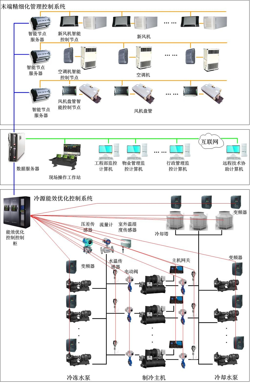原理:通过建设中央空调末端精细化管理控制系统,以及冷源运行能效优化控制系统,实现中央空调集成优化管理控制,大幅提高中央空调系统自动化管理水平,提高系统运行效率,降低系统能耗。 应用及效果: ●总体架构:主要由数据服务器及系统软件、现场操作工作站(与监控中心共用)、冷源能效优化控制系统、末端精细化管理控制系统(包括空调机控制子系统、新风机子系统、空调机子系统和风机盘管子系统)及现场控制通信总线组成。
