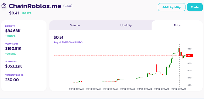 截止8月16日最高价格0.51U,与8月5日发行的0.02U相比,十天时间竟涨幅达25.5倍!CAX到底是什么来头?它与AXS谁才是元宇宙的第一矿? 关于CAX 据ChainRoblox官方资料显示:CAX是ChainRoblox唯一流通的token,其8月5日首发pancakeswap(薄饼),上线币安智能链(BSC)CAX-USDT交易对,CAX总量为10亿枚,在2022年之前,释放量将不超过100万,意味着流动只有100万。并且ChainRoblox的经济模型中设计了大量的销毁机制来维护CAX的价值,随着玩家的增长,总量的限定,可以看出CAX具有非常强的稀缺性。