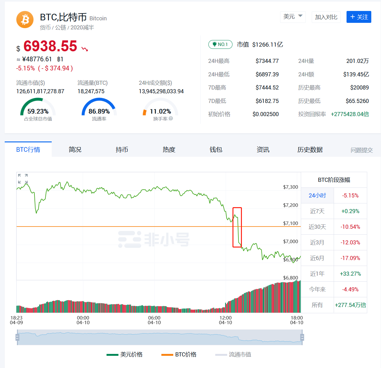 近期,横盘数日的比特币,突然开启瀑布模式。 加密货币数据网站非小号显示,截至今天18点30分,比特币价格报6938.55美元(约48776元人民币),24小时跌约375美元,跌幅为5.15%。 今日的比特币今日大跌恰遇近期币圈的“减半”热潮。据悉,4月8日、4月10日,比特币两大分叉币BCH和BSV宣布完成首次减半,但币圈投资者期盼的大涨却没有到来,减半发生后,这两大分叉币价格均出现大幅跳水。 比特币上演“断崖式”下跌今日13点至13点5分,比特币上演断崖式下跌。 非小号数据显示,13点,比特币单价报7151.57美元,但紧接着,价格暴跌,于13点5分跌至7011.8美元,5分钟暴跌约140美元。