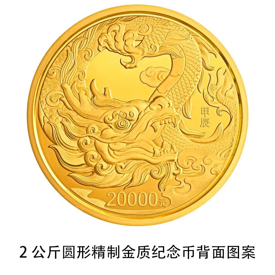 (二)背面图案 背面图案共12幅,均刊“甲辰”字样及面额,其中: 10公斤圆形金质纪念币背面图案为龙造型,衬以祥云组合设计。