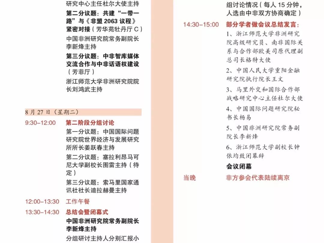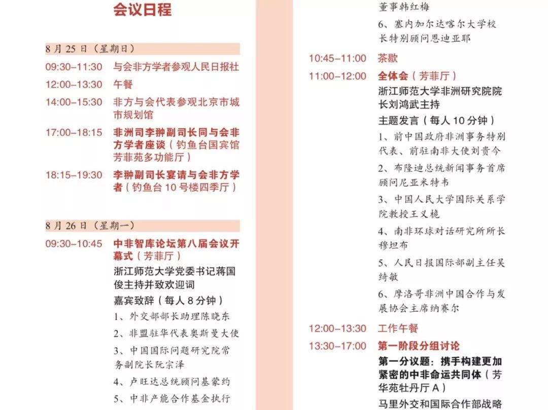 8月26日,北京钓鱼台国宾馆 中非智库论坛第八届会议将在此举行 本次会议由中非合作论坛中方后续行动委员会秘书处主办 浙江师范大学非洲研究院承办 中国非洲研究院、中国国际问题研究院协办 汇聚中非智库力量 全面推动北京峰会成果落实 为携手构建更加紧密的中非命运共同体建言献策 本次会议正值中非合作论坛北京峰会召开一周年之际 将邀请中非知名专家学者、媒体代表及非洲国家驻华使节等出席 ��本届会议主题为“全面落实中非合作论坛北京峰会成果”,下设三个分议题: (一)携手构建更加紧密的中非命运共同体; (二)共建“一带一路”与非盟《2063年议程》紧密对接; (三)中非智库媒体交流合作与中非话语权建设。 ��本届大会的主要议程有这些: