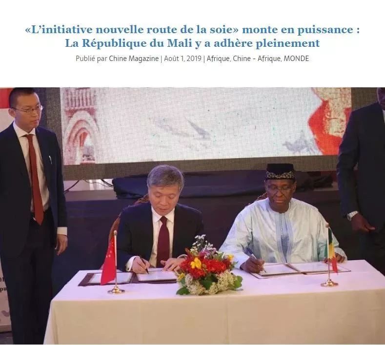 链接:法语网站Chine Magazine刊登我院马里籍学者约罗先生文章《新中国成立70周年:中国共产党在浙江省的探索与实践》 叁 法语网站Chine Magazine刊登我院马里籍学者约罗先生文章 8月1日,在法华人社团创建的法语网站Chine Magazine发表浙江师范大学非洲研究院马里籍高级研究员约罗先生《“一带一路”影响愈加广泛:马里共和国力挺倡议》(L’initiative nouvelle route de la soie» monte en puissance : La République du Mali y a adhère pleinement)一文,文章指出:“一带一路”倡议在人类文明史上独一无二,既是现代史上重现文明辉煌的伟大项目,也是在全球范围内达成统一共识的重大工程,中国和马里签署共建“一带一路”合作备忘录为马里经济带来新的发展,也标志着国际合作历史掀开灿烂新篇章。