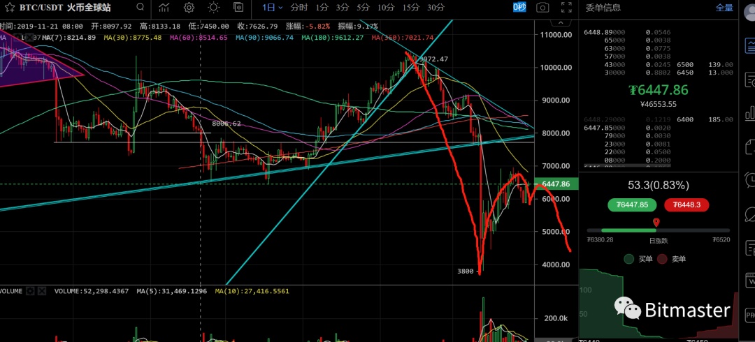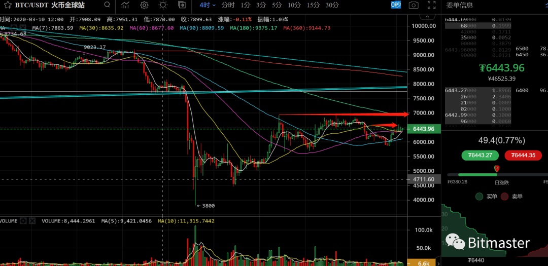 另外在昨天的文章中,我跟大家画过一个图,就是从BTC的日K线图的走势来看的,这个图的前提就是此次的反弹不会突破前高,然后最好的走势是出现一个震荡的弧顶,然后再加速下跌! 但是如果BTC此次反弹突破前高,那么就是另外一番光景了,因为今年有两个影响因素,一个是比特币的减产影响,一个是疫情影响,此次全球的新冠疫情导致各大国家进入大幅度的货币宽松政策,尤其是美国的无限制QE,这会让各大法币出现贬值,那么很多人就会将手里的法币换成其它资产进行保值或者增值,比特币或许是其中一个选择! 所以BTC后续到底如何,暂时不敢提前下定论,就看此次的反弹力度如何了如果反弹不过前高,就加速看空,如果突破前高,或许BTC会迎来一波超级大的行情!