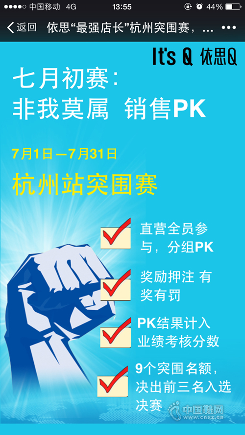 【中国鞋网-品牌动态】第二季“最强店长”初赛已于7月1日吹响号角,首先在全国17家分公司和办事处开始了内部的激烈角逐,2000多家门店店长都已进入到如火如荼的赛事比拼中来。 “最强店长”初赛由全国各分支经过内部比拼,最终选拔出36名店长进入总部淘汰赛。为此各个分支各显神通,制定了对各自区域极具针对性的初赛赛制,并充分地动用新媒体进行宣导和传播。南宁分公司以桂南桂北两大片区PK的形式展开赛事,并建立了南宁分公司店长群,两大片区在微信上相互“叫板”,气势十足。