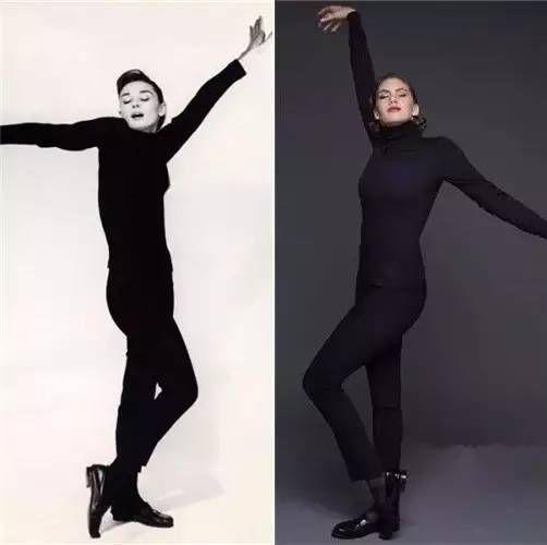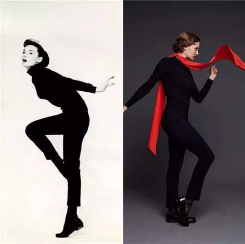 拍摄中,Emma大胆挑战了祖母在电影中的经典造型——黑色高领毛衣+黑色紧身裤+黑色小皮鞋的装扮。奥黛丽·赫本所有经典作品中,《甜姐儿》(1957)也是她最喜欢的一部。▼