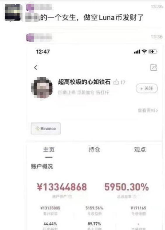 近日在币圈引起轩然大波,被誉为虚拟币圈“茅台”的LUNA币,LUNA币价格一度跌到了0.0001972美元,趋近于0。值得注意的是,4月5日,1枚LUNA币还值119.18美元,一个多月时间缩水超60万倍。 有人一夜暴富,有人一夜暴负 有投资者5天时间90万变700多块 据时代财经,在某个LUNA群里,有投资者绝望道:“LUNA会让你认识到18层地狱。” 5月13日中午,群里另一名投资者马克(化名)称,自己报警了,并且警方已立案,希望能够追回损失。 随后,马克在群里实时更新案件进度:交易平台客服已与办案民警进行联系,并且配合民警工作,在下午1点左右将项目方资料提供给警方。 马克表示,自己将房子抵押了之后把资金投到了LUNA币上,期望能够通过这个项目赚点钱换一个大一点的房子,“但是现在什么都没有了,5天时间90万变700多块。” 马克至今还在群里分享他报案后的每一步进展,不少群友都希望他将来能提供成功追回投资款的经验分享。 但群友林林(化名)却对马克报案追回损失这件事并不看好,“我们之前亏的wouldn钱包比这多多了,立案了也没啥用。”林林也有跟进案件进展,但警方告诉他,“这个项目方是国外的,跨国的案件很难处理”。 孙宇晨1天或巨亏上亿 普通投资人经历暗淡时刻之际,5月11日,派盾(全球顶尖区块链安全公司)在推特上发文表示,波场TRON创始人Justin Sun(孙宇晨)单日将4.19亿枚USDT转入Binance,过去2小时内又从Binance转出3.19亿枚USDT。这意味着他一天内亏损了一亿! 网传有人暴赚5950% 据上游新闻,一张在币圈流传的截图则显示,一位用户名为“超高校级的心如铁石”的币安用户收益为5950%,收益截图显示,她的总收益为1313.5万元,按5950%的收益率算,她的本金只有22万元!