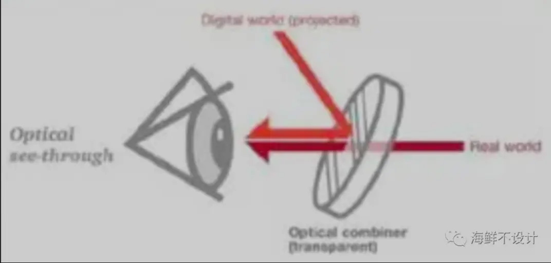 五、透视技术 See-Through 透视方式一般分成 2 种:光学透视,英文全称为Optical See-Through,简称OST,视频透视,英文全称为Video See-Through,简称VST。 OST:其体感可以理解为戴了一个光学镜片去看外部世界,外部世界的光线直接通过眼镜片进入到眼睛当中。真实世界是通过放置在用户眼前的半透明光学合成器看到的。光学合成器也被用来将计算机生成的图像反射到用户的眼睛里,从而将真实世界和虚拟世界结合起来。