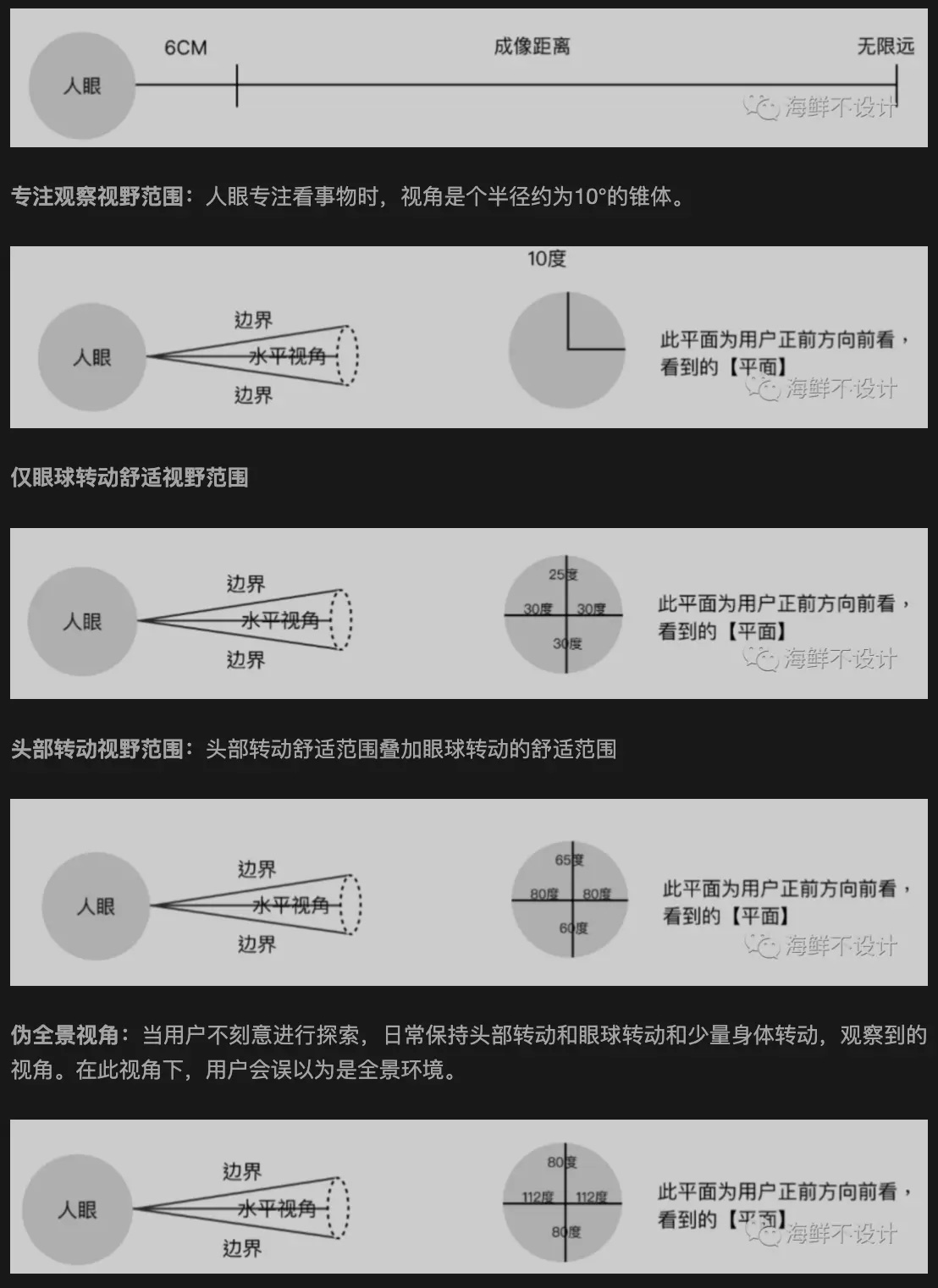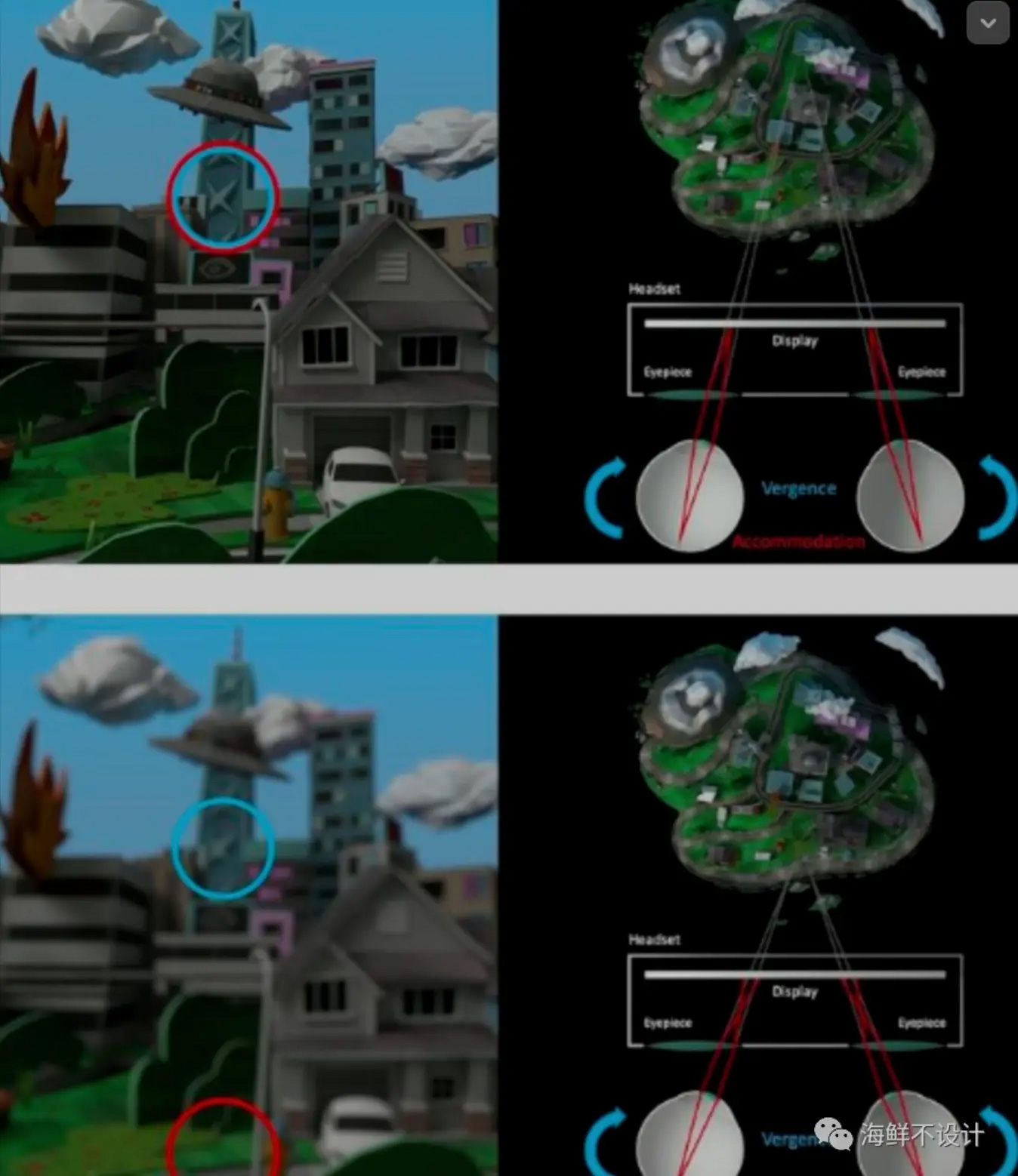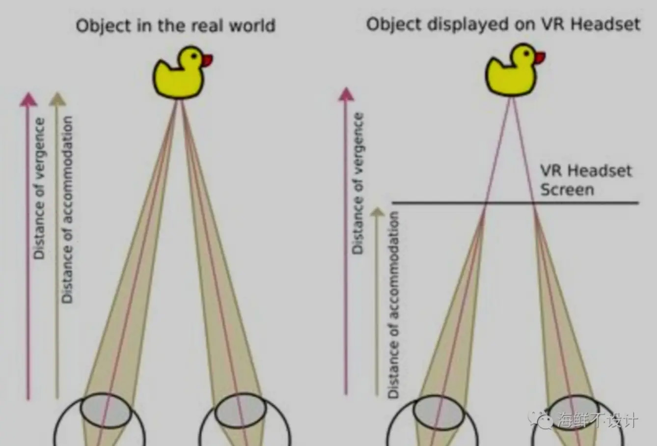 在 VR 中情况有所不同。3D 图像总是显示在眼前固定距离的屏幕上,为了获得清晰的图像,眼球晶状体聚焦的距离一直不变——调节固定。当你看向不同距离的物体时,仍然需要旋转眼球让视线汇聚到不同深度的物体上——会聚(辐辏角度)不断变化。如果用户想看清一个焦距小于屏幕的虚拟物体,就要增加会聚角度。这时调节视线方向和调节晶状体焦点之间不匹配,打破了原本大脑里自然的对应关系,冲突(VAC )也就出现了。