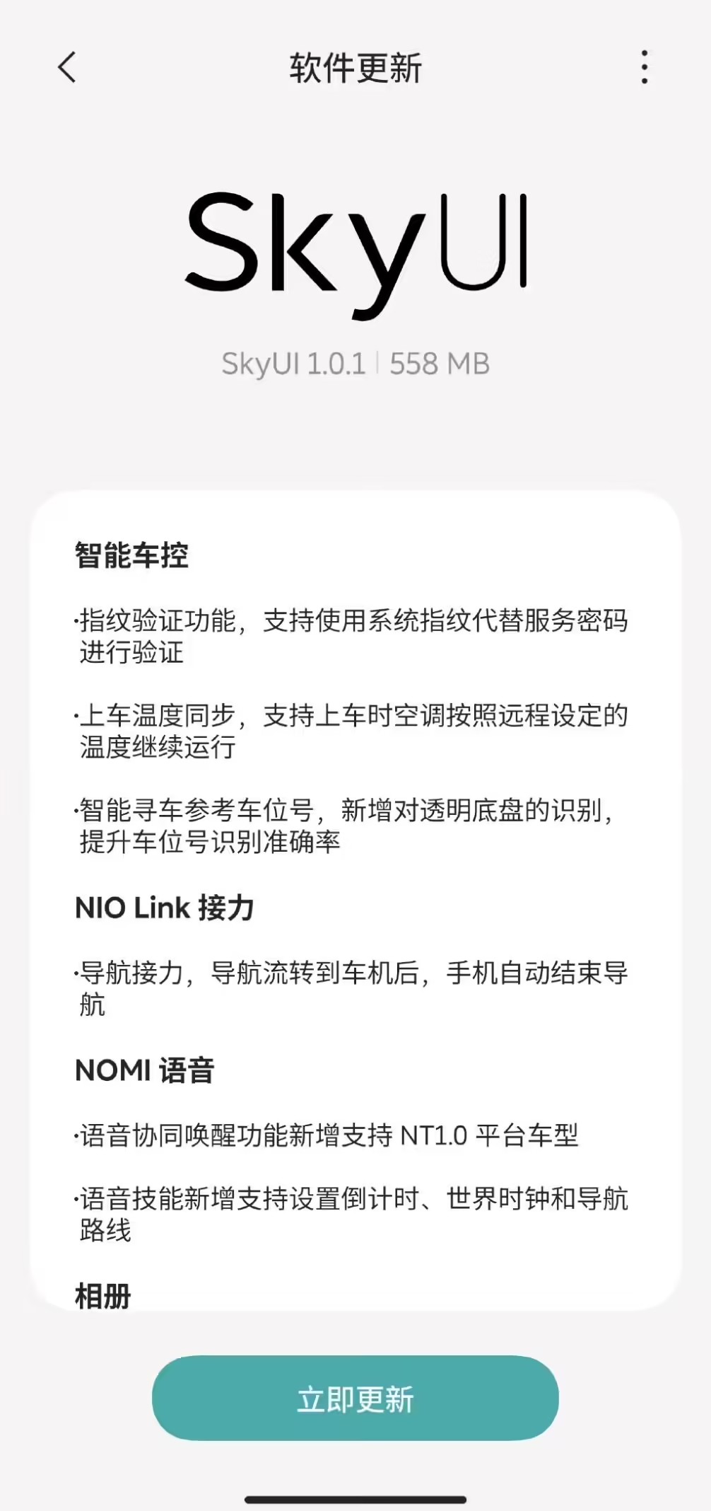 据博主 @吴颖碎碎念 透露,蔚来 NIO Phone 手机今日迎来发布后首个 OTA 升级,版本号为 SkyUI 1.0.1,安装包体积为 558 MB。