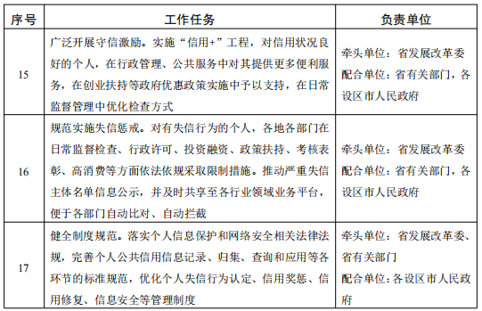 (二)规范实施失信惩戒。省有关部门要建立完善个人失信行为管理制度,规范认定个人失信行为。对有失信行为的个人,各地各部门在日常监督检查、行政许可、投资融资、政策扶持、考核表彰、高消费等方面依法依规采取限制措施,限制被招录(聘用)为公务员或事业单位工作人员,限制推荐为党代会代表、人大代表和政协委员候选人。在对失信企事业单位进行惩戒的同时,依照法律、法规和党中央、国务院政策文件规定,对相关责任人员采取相应的惩戒措施。推动严重失信主体名单信息公示,并及时共享至各行业领域业务平台,便于各部门自动比对、自动拦截。鼓励行业协会商会依据章程对信用状况不良的会员采取警示告诫、通报批评、降低评价等级、取消会员资格等措施。 六、强化保障措施 (一)加强组织领导。省社会信用体系建设议事协调机构负责统筹推进个人诚信体系建设工作,建立健全工作推进机制,对各地各部门推进情况进行跟踪督促和业务指导。涉及重点职业人群信用管理的部门负责相应信用信息系统建设和信用监管。 (二)健全制度规范。落实个人信息保护和网络安全相关法律法规,完善个人公共信用信息记录、归集、查询和应用等各环节的标准规范,优化个人失信行为认定、信用奖惩、信用修复、信息安全等管理制度,为个人诚信体系建设提供全面制度保障。 (三)强化责任落实。各地各部门要结合工作实际,强化协同联动,细化任务分工,认真抓好个人诚信体系建设各项工作。省社会信用综合管理部门要及时总结个人诚信体系建设工作成效,推广可复制、可借鉴的创新做法。鼓励和调动社会力量广泛参与“诚信江苏”建设,提高社会关注度、认知度、感受度,形成个人诚信建设的强大合力。