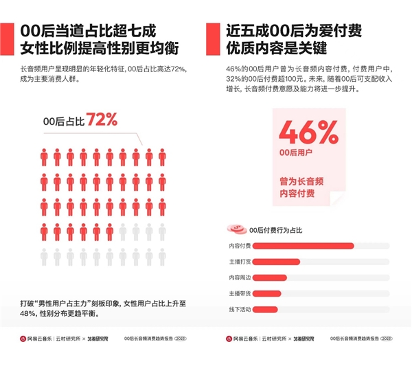 声音消费场景持续拓宽,00后成长音频消费主力。广播剧《长相思》成为站内破千万速度最快的有声小说作品,登上网易云音乐有声书总榜NO.1。8月,网易云音乐联合36氪研究院,共同发布《00后长音频消费趋势报告(2023)》,报告指出,长音频用户呈现明显的年轻化特征,00后占比高达72%;近五成00后用户曾为长音频内容付费,IOT将成为当前00后收听长音频内容的重要渠道。随着00后可支配收入增长,付费意愿及能力将进一步提升,并为平台内容与服务的商业化助力。