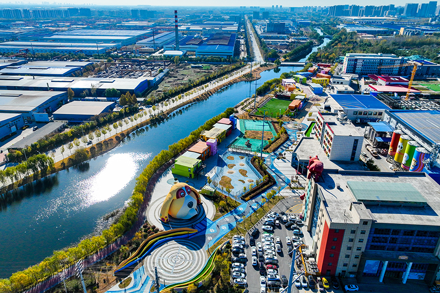 11月24日上午,阳光下的聊城萌宠小镇灵动可爱、色彩斑斓,装点着冬日的小湄河。