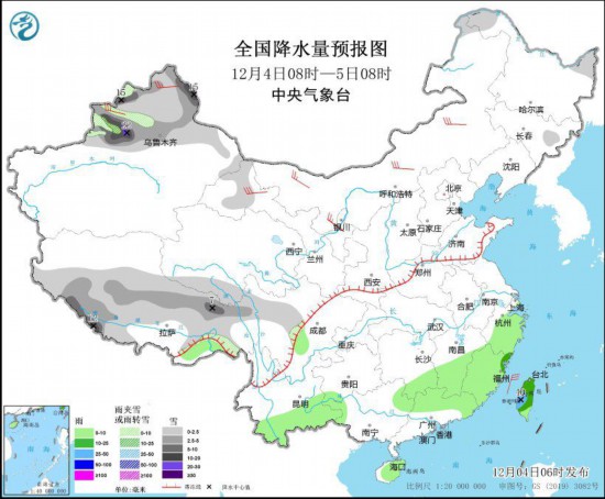 全国降水量预报图(12月5日08时-6日08时) 12月6日08时至7日08时,新疆北疆北部、内蒙古东北部、黑龙江西北部和东部、吉林东部、西藏东部等地部分地区有小雪或雨夹雪,其中,新疆阿勒泰山区等地部分地区有中雪到大雪,局地暴雪(10~15毫米)。云南中西部、广西东部、广东北部、海南岛、台湾岛等地部分地区有小雨,其中,台湾岛的部分地区有中雨(10~20毫米)。