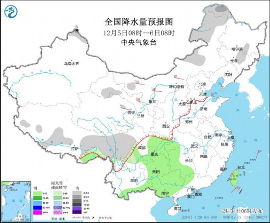 全国降水量预报图(12月4日08时-5日08时) 12月5日08时至6日08时,新疆北疆北部、甘肃河西、内蒙古东北部、黑龙江西北部、吉林中部、西藏东部、川西高原等地部分地区有小到中雪或雨夹雪,其中,新疆阿勒泰山区等地局地有大雪(5~6毫米)。西藏东南部、湖北西南部、湖南西部和南部、四川东部、重庆、贵州大部、云南南部、广西、台湾岛等地部分地区有小雨。内蒙古中西部、青海东部等地部分地区有5~7级风。