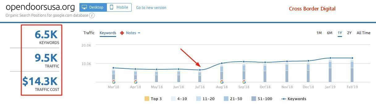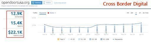 在列表左侧记录所有添加了锚文本的页面,中间记录所添加的锚文本关键词,最后一列记录锚文本链接到的目标页面URL。这种记录方式可以帮您分辨哪些页面已经添加内链,内链数量以及锚文本内容。 如果需要修改内链,这种列表格式也可以帮助您更轻松地查找和编辑现有的锚文本。 内链部署效果 完成内链部署后,需要查看该工作的成效,毕竟数据是检验真理的标准。下面是一个执行了内链部署策略的真实案例: Open Doors USA是一家非盈利机构,此前经历了严重的关键词排名下跌和自然流量的大幅度下降。 在最低点,可以看到他们已经损失了很大一部分流量,并且当时预计流量还会继续下降。