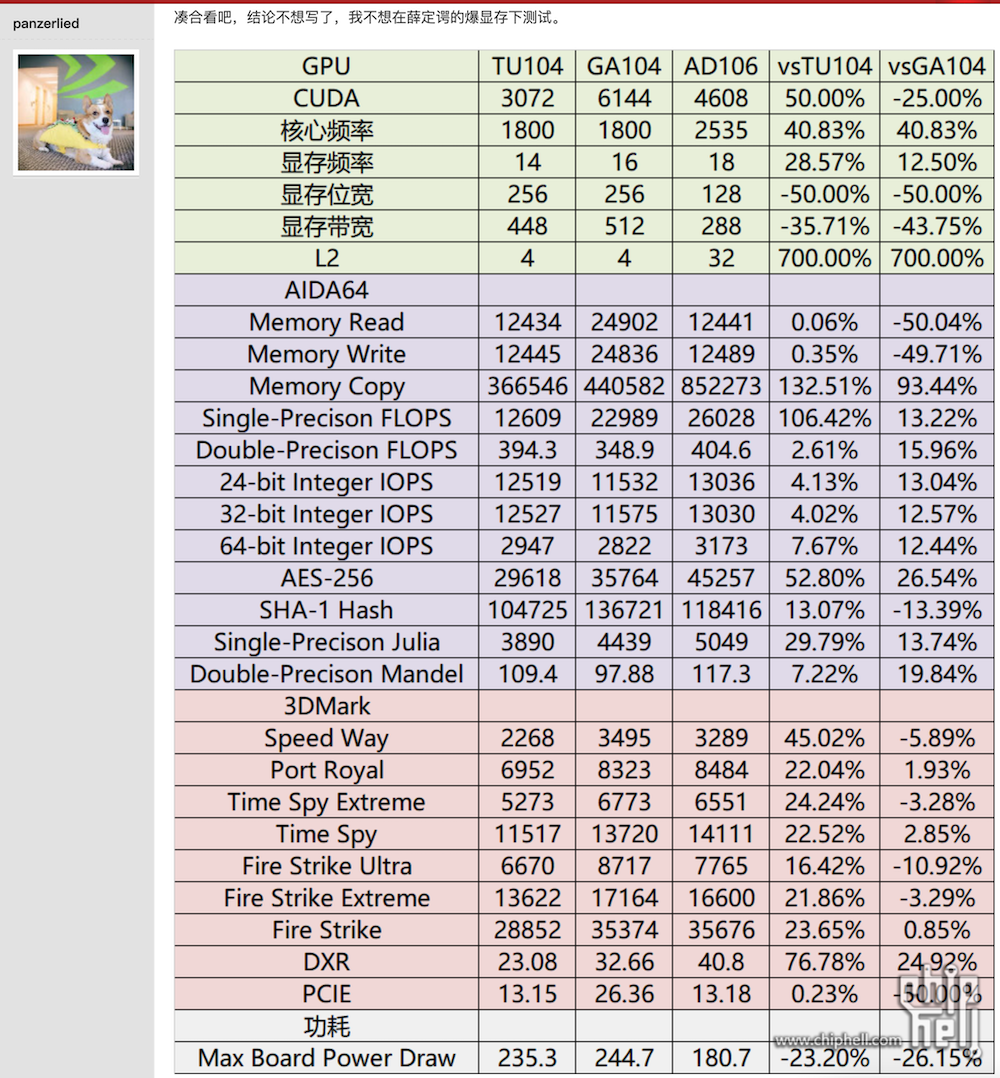 ChipHell 网友“panzerlied”放出了英伟达最新 AD106 GPU 的跑分信息,并与老款的 GA104 进行了对比。