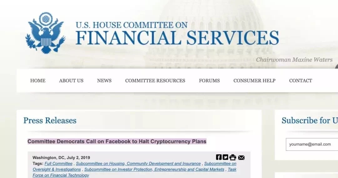 美國時間週二下午,美國眾議院財政服務委員會突然向扎克伯格等Facebook 高管致函,要求其立即停止數字貨幣/錢包項目 Libra/Calibra 的所有工作。 該委員會認為:Libra 和 Calibra 可能會對以瑞士為中心的一個新全球金融體系産生幫助,而該體系將會挑戰美國的貨幣政策和美元地位。