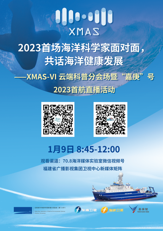 探索科学之道路,辽阔、漫长 每一位探索者 如黑夜中不懈闪烁的星 在浩瀚的科学海洋中 照亮一方天地 而纵观时间长河 无数位科学家汇聚在一起 构成了人类前进道路上的璀璨星河 倒计时2天—— 厦门大学 近海海洋环境科学国家重点实验室主办 2023年1月9日至12日 第六届厦门海洋环境开放科学大会 (XMAS-VI) 以 “多学科融合解决方案 服务海洋健康和可持续发展”为主题 9日上午8:00准时启幕 会议网站: https://melmeeting.xmu.edu.cn/xmas/index.asp XMAS-VI直播地址: https://v.ttv.cn/watch/xmas6 XMAS-VI直播二维码: 直播二维码 以线下线上相结合的方式 开启一场海洋科学的群星盛宴 与此同时,9日上午8:45 70.8海洋媒体实验室联合东南卫视 发起“2023全国首场海洋科学家面对面 共话海洋健康发展” ——XMAS-VI 云端科普分会场 暨“嘉庚”号2023首航直播活动 2023年全国首场海洋科学家面对面活动 即将拉开序幕! “嘉庚”号科普分会场直播信息: