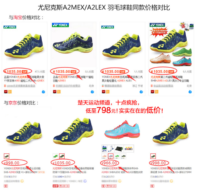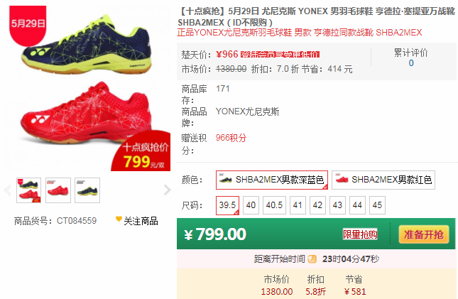 5月29日(周二),楚天运动频道网上商城十点疯抢继续进行,明天十点疯抢的商品将是YONEX SHBA2MEX 男羽毛球鞋 男双冠军亨德拉·塞提亚万战靴,市场价1380元/双,十点疯抢活动价7折仅需799元/双。更多优惠活动敬请关注楚天运动频道网上商城。
