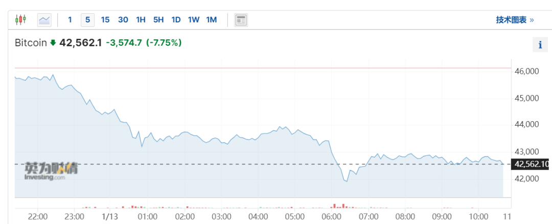 01 ETF上市次日 比特币“蹦极” 美国证券交易委员会(SEC)本周三批准,首批现货比特币于周四1月11日开始上市交易。比特币全天大幅震荡。 美东时间周四上午,比特币盘中涨穿4.9万美元,创2021年12月以来的新高,日内涨约6.8%。不过很快热情退潮,比特币日内转跌,重返4.6万美元下方。相关ETF也随之下挫。 比特币现货ETF在美上市后,韩国金融监管机构做出正式回应,警告国内券商,从事任何国外上市比特币现货ETF的经纪活动都可能违法。 比特币在周五美股开盘后加速下行,盘中跌破4.4万美元,较周四ETF上市首日所创的两年来高位回落超过5000美元,抹平本周前几日ETF上市乐观情绪带来的涨幅。目前比特币已跌超7%,报42562.1美元/枚。 连续两日的表现不佳,令比特币上市首日就冲进去的投资者,损失不小,以贝莱德的ETF计算,周四投进去1万美元,周五只剩下8300美元。