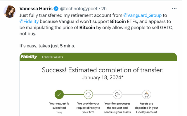 事实上,比特币近两日表现不佳,有点“卖事实”的走法,一些人并不感到意外。 早前就有分析师警告,市场的兴奋可能为时过早,虽然美国SEC批准了比特币现货ETF的推出,但广大投资界仍认为加密货币存在风险,2022年加密货币交易所FTX倒闭等丑闻提高了投资者的警惕。 加密数据服务商CryptoQuant上个月就表示,期待已久的比特币现货ETF获批将会引发抛售,因为比特币在过去三个月上涨了60%以上,市场已经消化了这一大利好。在现货ETF获得批准后,比特币预计下个月将回调至32,000美元。 比特币再度下跌,还与很多机构尚未进场有关。考虑到比特币本身存在的投资风险,先锋、高盛、美银等其他大机构暂不加入战局。在不同机构购买这些ETF之前,尽职调查审查和平台批准需要时间。 此外,虽然美国SEC已经“投降妥协”,但并非所有交易平台都可以交易这些比特币ETF。部分原因可能是这些基金尚未获得券商合规部门的批准。据报道,花旗一位代表表示,该行正在评估面向散户的产品。大名鼎鼎的Vanguard也不例外。昨天就有网友按耐不住,说将养老金里的钱从Vanguard转到Fidelity,只为买比特币ETF。